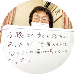 左膝が歩くと痛みがあったが、施術のあとはレベル10程だった痛みがレベル5くらいになりました。(一関市にお住いの60代女性・会社員)