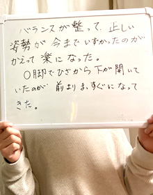 バランスが整って、正しい姿勢が今までいずかったのがかえって楽になった。O脚でひざから下が開いていたのが、前よりまっすぐになってきました。